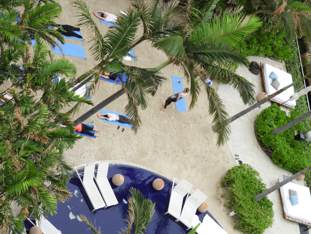 月曜はサンセットプール脇でヨガはいかがでしょう?ホテル宿泊者は無料で受けられ、ヨガマットも無料貸し出ししています。